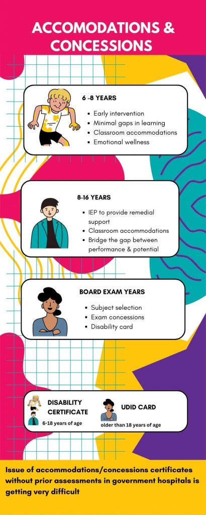 It is important that the child gets an assessment done in a government hospital at the earliest (6 years and above). It becomes easy when the child requires concessions and accommodations for the board exams when the child is already enrolled into the government system.